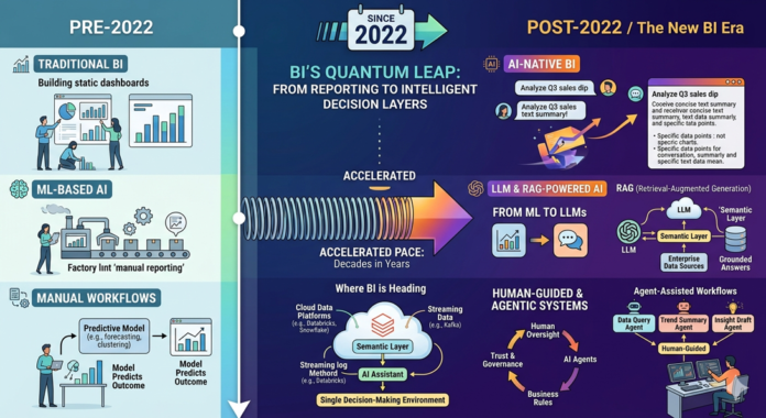 Since 2022, Analytics and BI have moved faster than any previous decade in the field. The big change is that BI is no longer just about dashboards, reporting, and cloud data platforms; it is becoming an AI-assisted decision layer built on LLMs, RAG, streaming data, governance, and human-guided agents.
