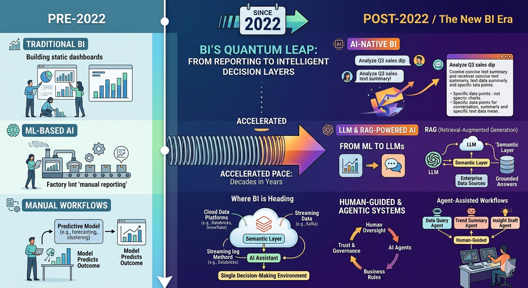 Since 2022, the pace of change has felt like a decade compressed into a few years because the analytics stack changed at every layer at once. The interface changed through LLMs, the knowledge layer changed through RAG, the workflow layer changed through agents, and the operating model changed through governance and human oversight. That is why modern BI now feels less like reporting software and more like an intelligent, conversational system for decision-making.